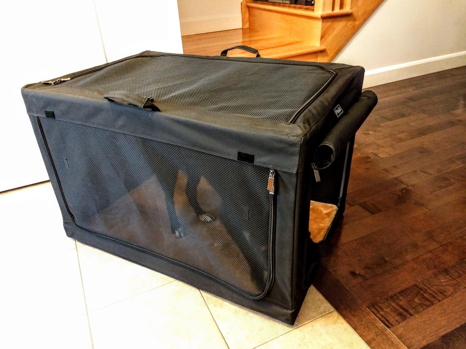Arrived earlier than expected. Doggy loves it! I wanted a fabric crate to put in my room to let her sleep with us, because her living room metal crate is noisy. Her new tent is awesome. The cushion seems OK. Very easy to set up and because of its light weight and the two top handles, it is super easy to cary around. It is just an inch shorter than the metal crate, but since we use it only for the night, it will do. My dog is a mix ~30 lbs. Only thing, I’m not sure it would hold my cats using the top mesh as a hamac so I unzip it during the day…