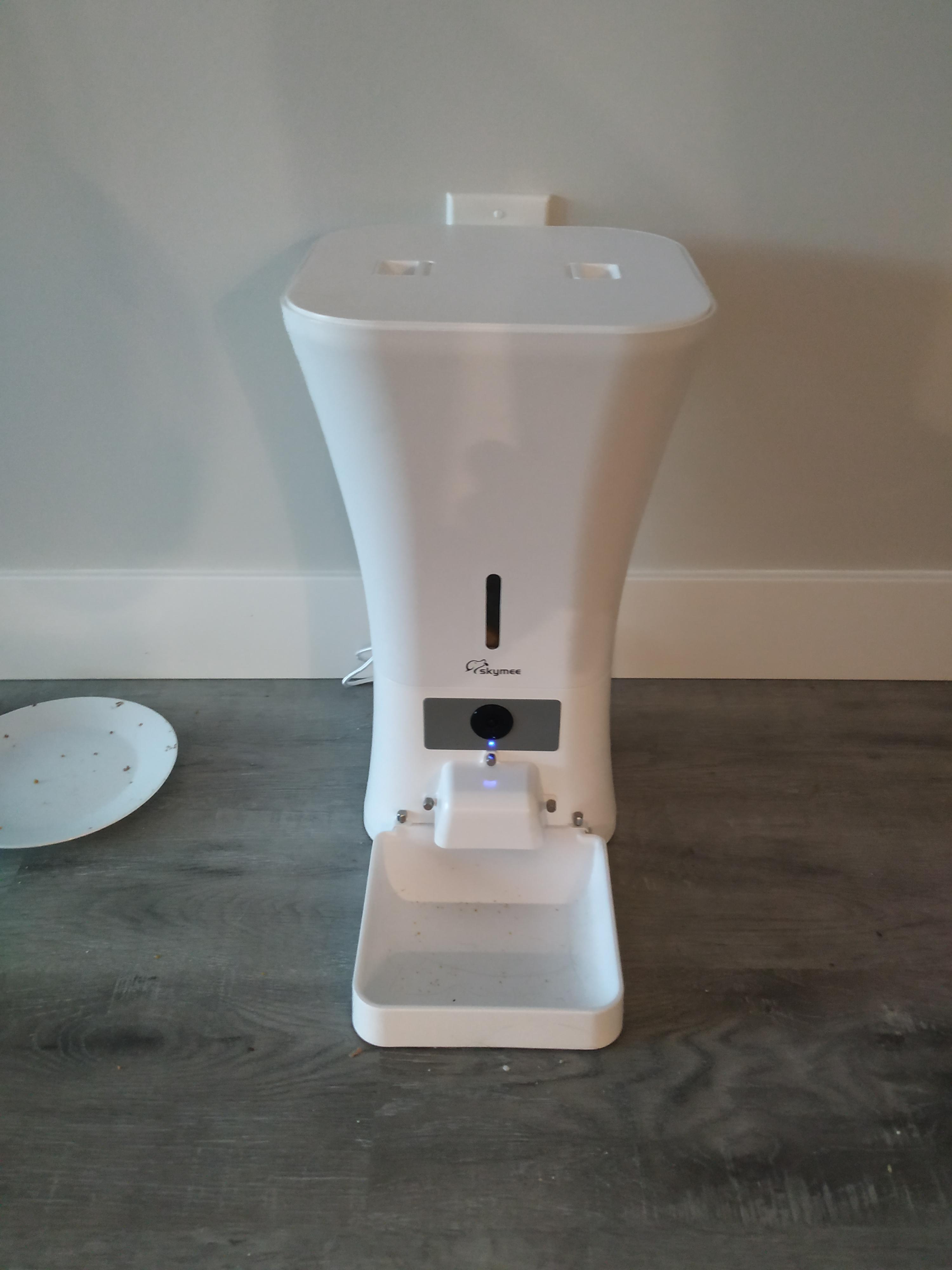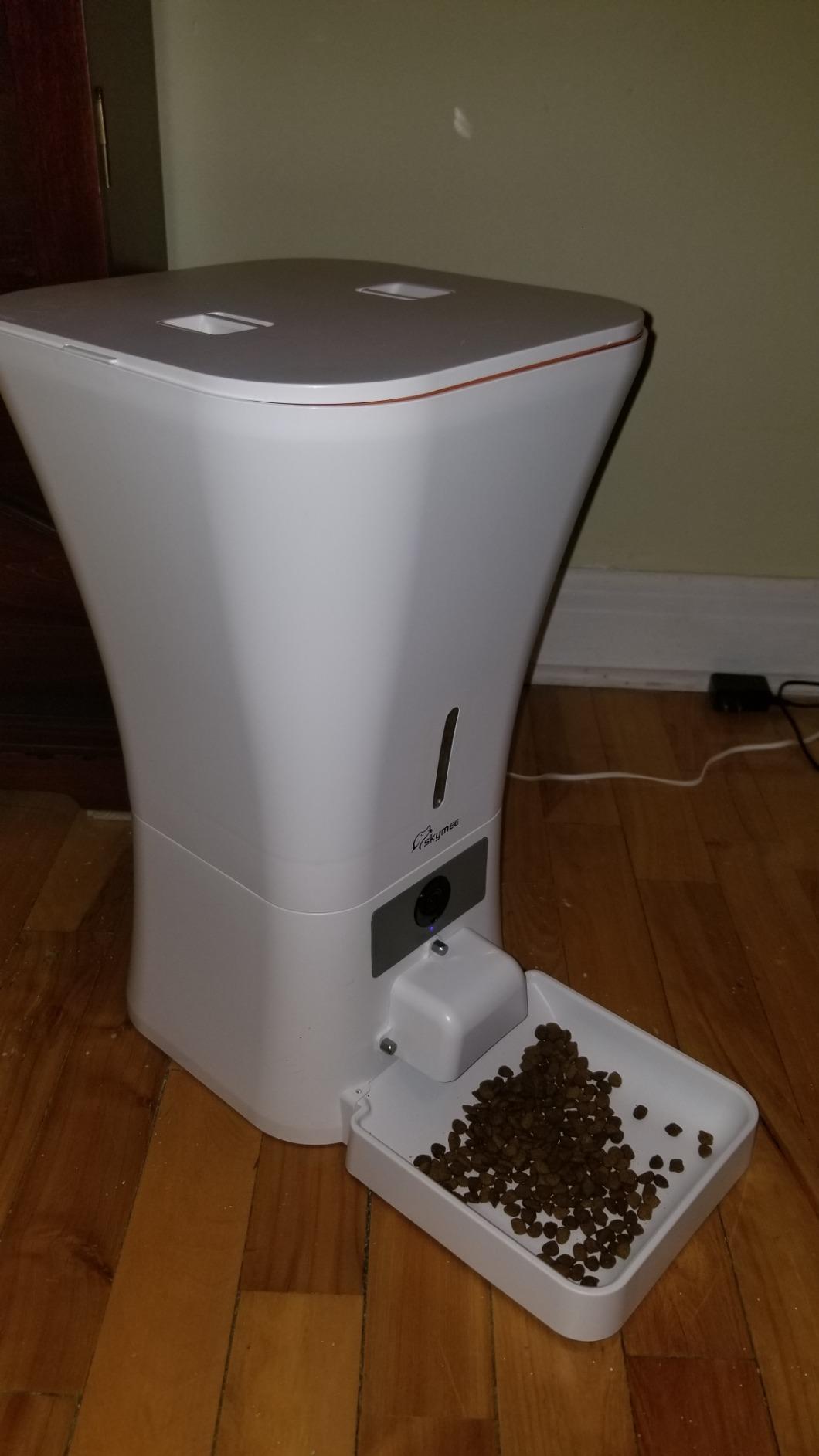 An expensive price tag but so far there have been no issues. Setup wasn’t too difficult and the dog soon learnt when the food was being dispensed. The only issue is if you try to feed too many portions it will not clear the drop spout and the app will alert you with a “Dispense excessive food” notification (iOS). This isn’t a problem if your pet is at the spout eating as fast as it comes out. Someone in another review modified their feeder by sitting it on some wood at a higher level than the feed trough and fastening it all in place so it can’t be knocked around. We have a small issue with ants being attracted to the feed trough but that is hardly a fault of the machine itself. Camera is good enough for you to see if your pet is feeding but the camera is only inches from their head – don’t expect cinema-quality video. Haven’t used the speaker and microphone function so can’t comment on that. Make sure you use pet food with a small enough pellet size for the machine to handle.
