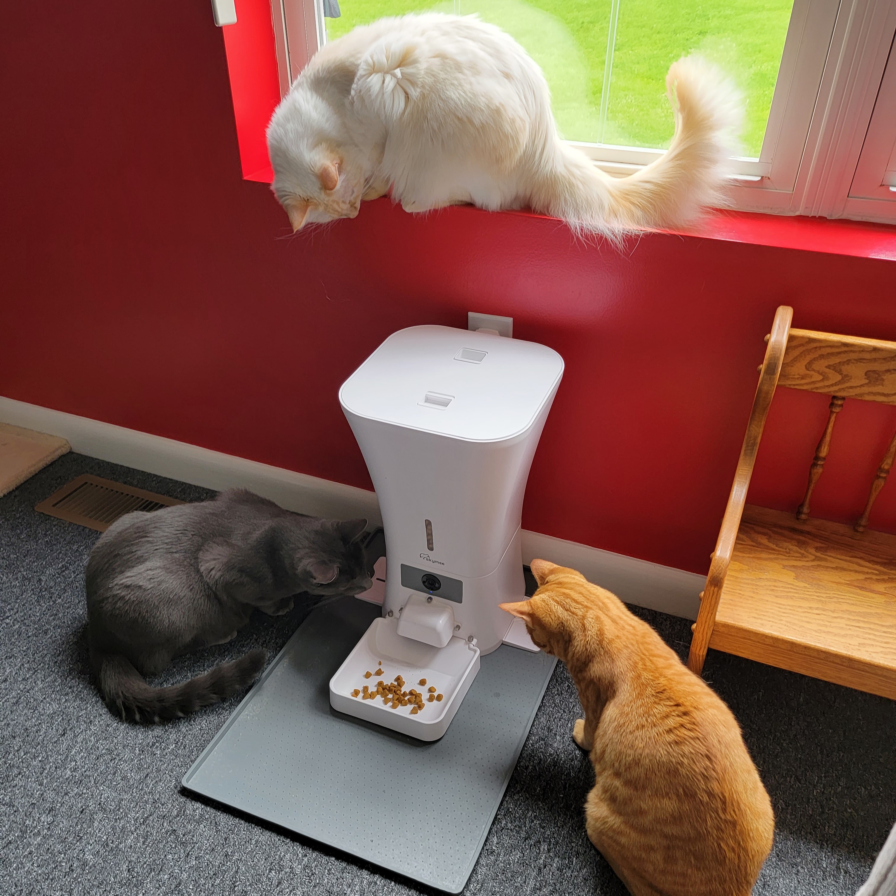I got the larger size and it holds enough that we only have to refill it every few months. I like that you can schedule multiple meals, pick portions, have a cam option, connect via app, has a well sealed lid, and the tray is easy to clean. It also has a voice function where you can record your voice to call them to eat, but we don’t use it.