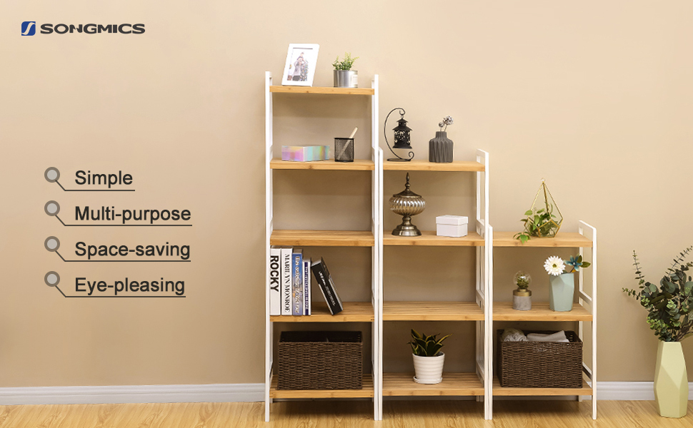 SONGMICS Bamboo Shelf, Kitchen Shelf, Bathroom Shelf, Bookshelf, Stand Shelf with 5 Shelves 45 x 31.5 x 142 cm, Ideal for Bathroom, Kitchen, Living Room, Bedroom, Balcony, Natural White BCB75WN