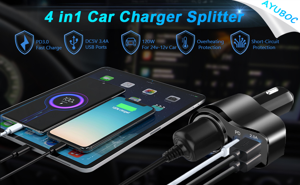 The AYUBOC car cigarette lighter charger provides 2 standard type A USB ports that output 5V at a total current of 3.4A plus it also has a separate 18W PD3.0 USB Type C port for fast charging phones or tablets and it retains the cigarette lighter socket functionality so you can plug in your car kettle or other 12V gadgets.