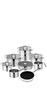 5 couvercles , 6 casseroles , 2 passeoires et 1 pole tous gradus et en inox de qualit + un revetement anti adesif .