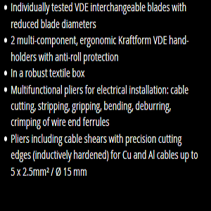 Este juego de destornilladores de electricista es muy completo y cmodo de utilizar y viene con unas alicates de la casa Knipex que resalta por su calidad.