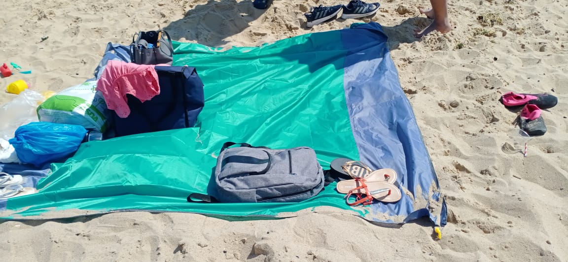 Perfect beach mat. Last week i used it on the beach. Plastic sticks nicely go in the sand and have a good grip. Very light and easy to travel. No sand stuck on this mat easy to wash. Colour is nice. It’s pretty large as well. Good value for money.