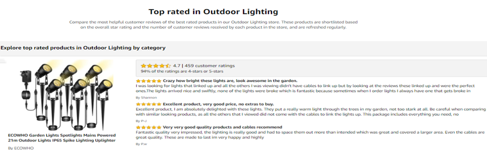 I ended up buying 12 lights for my garden. Great quality and very good value for money. Very easy installation with option to extend with more lights. A mains plug which is flat and neat and fitted two of these into my outside waterproof double socket comfortably. Had one faulty light, contacted the retailer direct and got an immediate response and replacement light through in the post. That’s great service when it matters. Would highly recommend