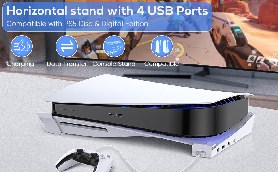 All-in-One Design; Horizontal Stand Accessories for PS5;Come with 4 USB Ports for Sync & Charge;Saving spaces and does not affect heat dissipation