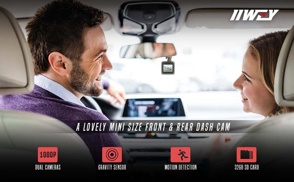 IIWEY Dash Cam Front and Rear 1080P Mini Size 32GB SD Card Included, 2 Inch LCD Screen Small Car Dash Camera for Cars with Night Vision, 170° Wide Angle, G-sensor, Motion Detection, Parking Mode