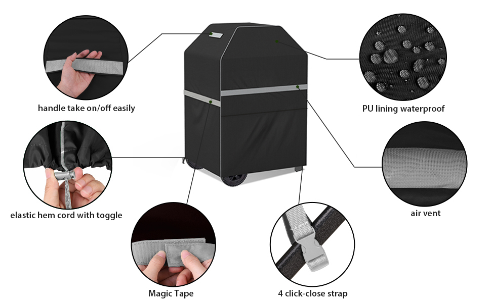 made On to the fitting .just slipped over the barbecue as if it was made for it Velcro straps to take up any loose at the sides .On the hem there’s 4 attachment straps which I’ve fitted around the wheel attachments great to stop your new barbecue cover when Windy flying off and heading into the wide blue yonder and an added hem pull cord to tighten around the bottom . There are mesh air vents just to keep away any moisture (nice touch) And you can see by the picture after a heavy rain downpour yesterday that it’s waterproof .All in all a great looking cover.