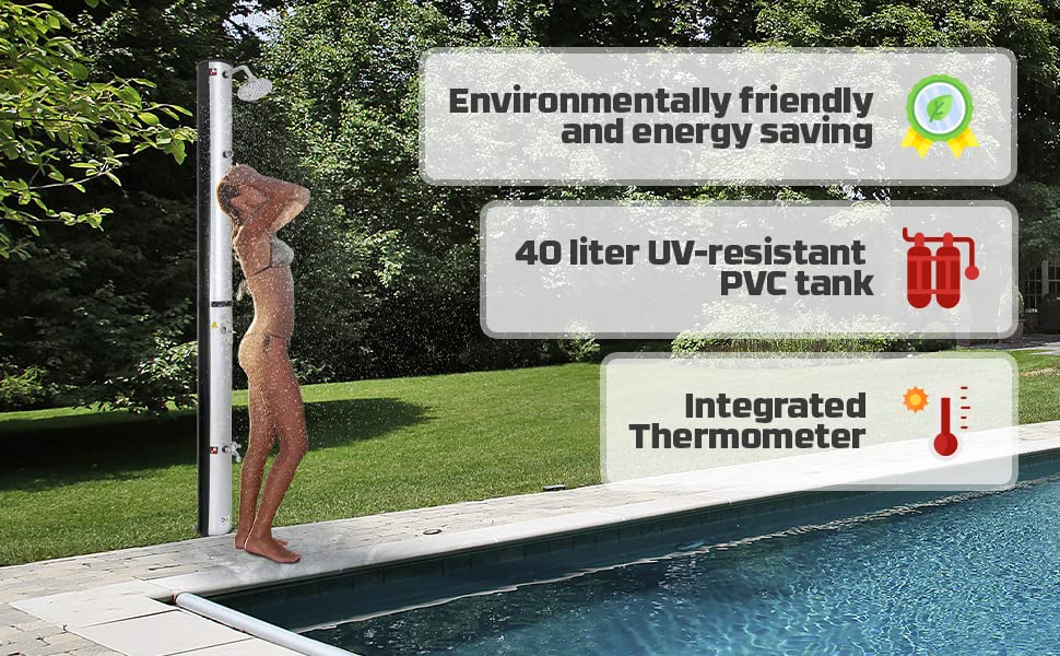 Wir haben die Solardusche fr unseren Pool im Garten erworben. Die Haltbarkeit muss ich leider noch in Aussicht stellen. Der Aufbau der Dusche ist sehr einfach, die Anleitung bersichtlich und einfach gestaltet, die Verpackung ist ordentlich und schtzt die Ware beim Versand vor Beschdigungen. Insgesamt macht die Dusche einen sehr wertigen Eindruck.Eine Kauf Entscheidung unsererseits war das integrierte Thermometer. Hier kann man im Vorfeld schon erkennen wie warm das Wasser in der Dusche ist und im Vorfeld die Temperatur runter regulieren.