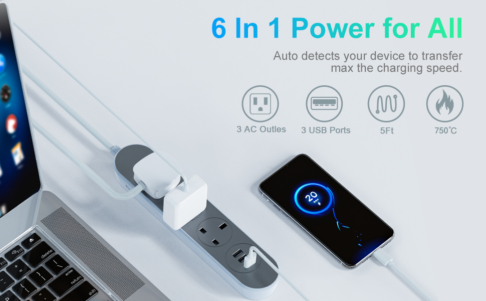 EyGde Extension Lead with USB Slots, 3 Way Socket Power Strip Surge Protector with 3 USB Ports, Charging Station with Overload Protection, 1.6M/5.2Ft Extension Cord