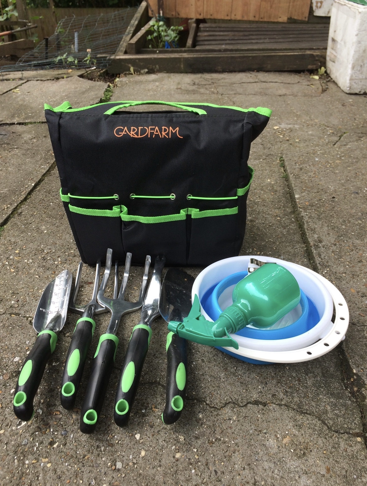 Questo un kit completo, per piante medie. Ottimo per il giardino, per smuovere terriccio e terreno con gli utensili vari e molto robusti: oltre a palette e rastrello di dimensioni diverse e con impugnatura ergonomica, c’ un secchiello pieghevole, un nebulizzafore di acqua, forbici per potatura e un rotolo di filo per piante. Tutti gli attrezzi possono essere inseriti nelle tasche di una comodissima sacca/borsa che uso per spostarli. Ottimi anche i guanti con artigli in plastica, per smuovere un po’ il terreno mentre si spostano le piantine.