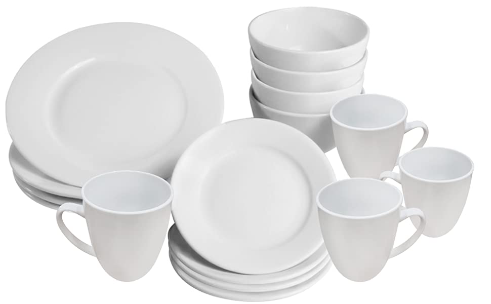 16 Piece White Porcelain Dinner Set | 4 Plates, Bowls and Cups | Party Dinnerware | Service Set for 4 | Dishwasher and Microwave Safe | Kitchen & Dining | M&W