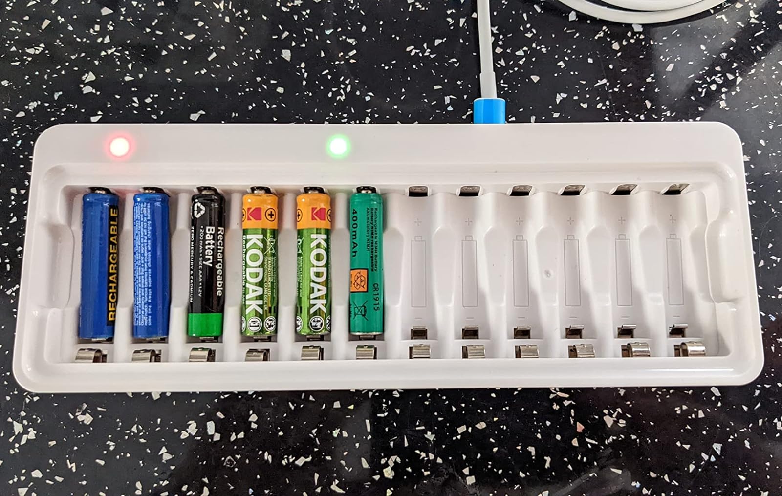This charger is fantastic! It’s well made and so versatile, in that it will charge up to 12 of either AAA and AA rechargeable batteries at the same time, all from a USB-A socket. This allows charging pretty much anywhere, in the car, from a computer, or many other places where you have the means of accessing USB power. A USB-A to Micro USB cable is included, but there’s also a USB-C port on the charger, so you can charger from USB-C too. Note the batteries are charged in pairs.