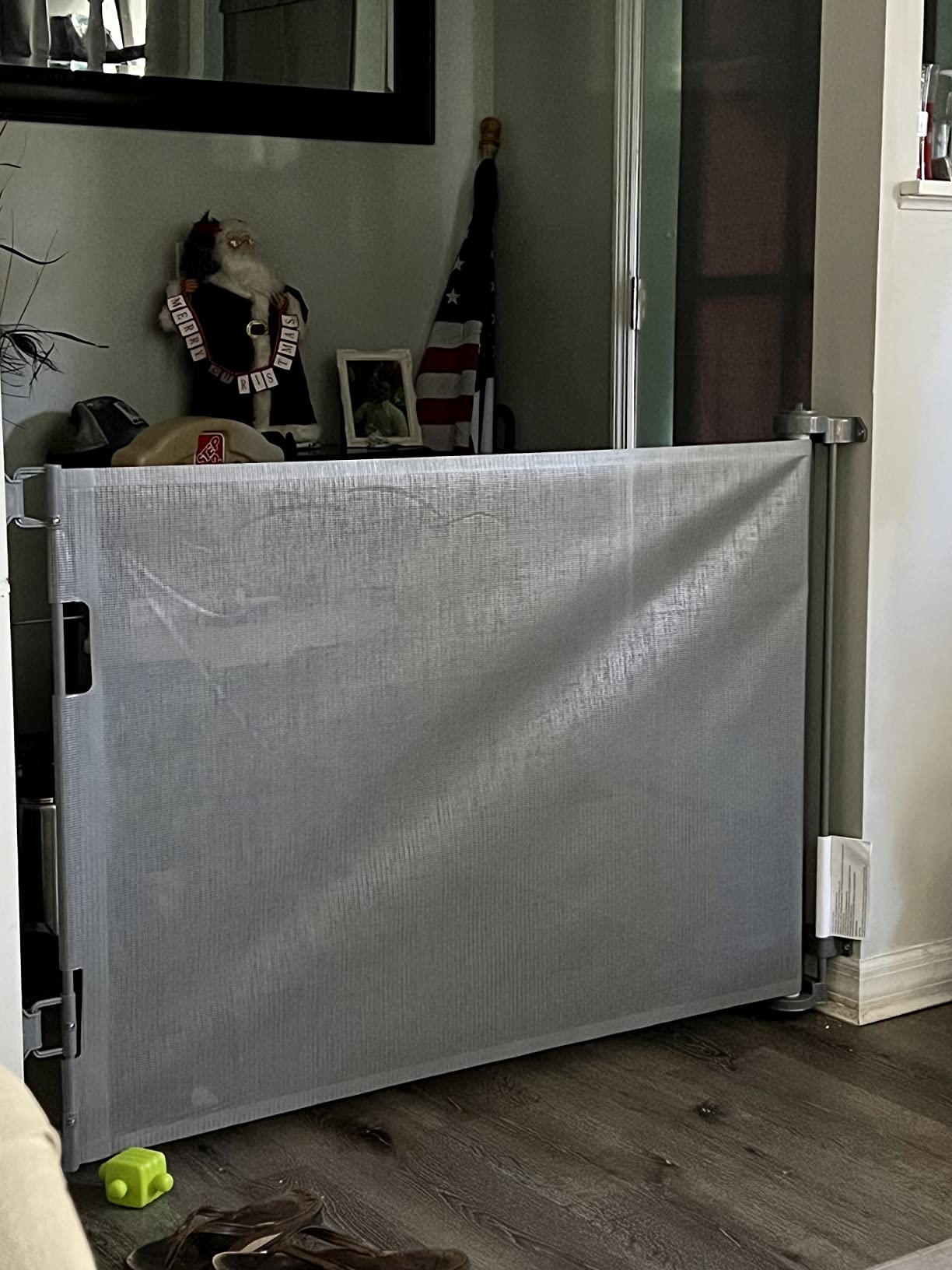 Really practical! I wish I bought one years ago, no more walking into open gates or struggling to get through with bags, completely retractable and covers a really wide width. Quality is good and the height is impressive, I’m also really pleased it’s slightly see through. I’m not sure how sturdy this would be for a larger breed but this is perfect for my Pomeranians, they’re claws don’t mark the fabric when they jump up either.
