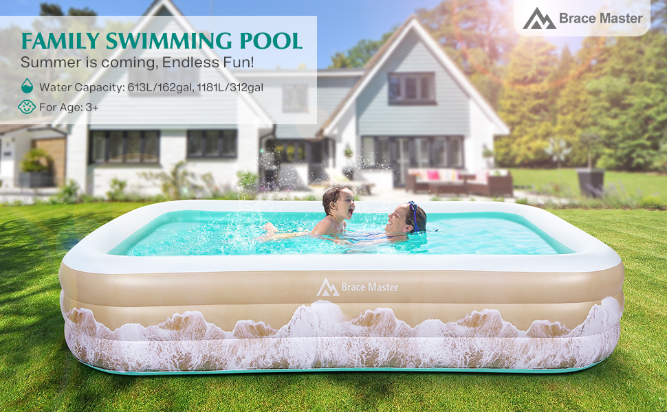 Brace Master Inflatable Swimming Pool, 305cm x 182cm x 56cm, Blow Up Pool, Family Kiddie Pools, Full-Sized Inflatable Pool for Toddlers, Kids, Adults, Outdoor, Garden, Backyard, Gree