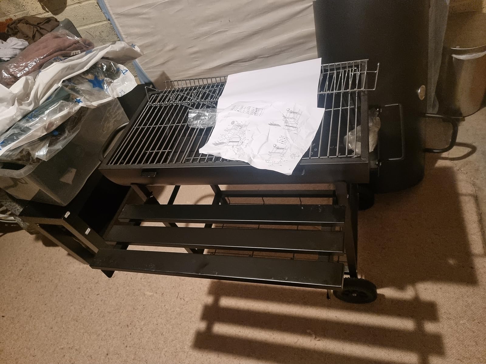 It took me about 30min to put it together, it’s big and it has a lot of options. Instructions is good enough to follow and quite easy to assemble. It’s big, enough to run decent size party all night long. I really like the charcoal shelf and the top grill option, as well as main grill with the little hatch to move the charcoal about. There is also a shelf to put up if needed. On top of the cover they added temperature guide so thats also quite good. Basically it’s really well made and delivered without any damaged whatsoever, good bbq.