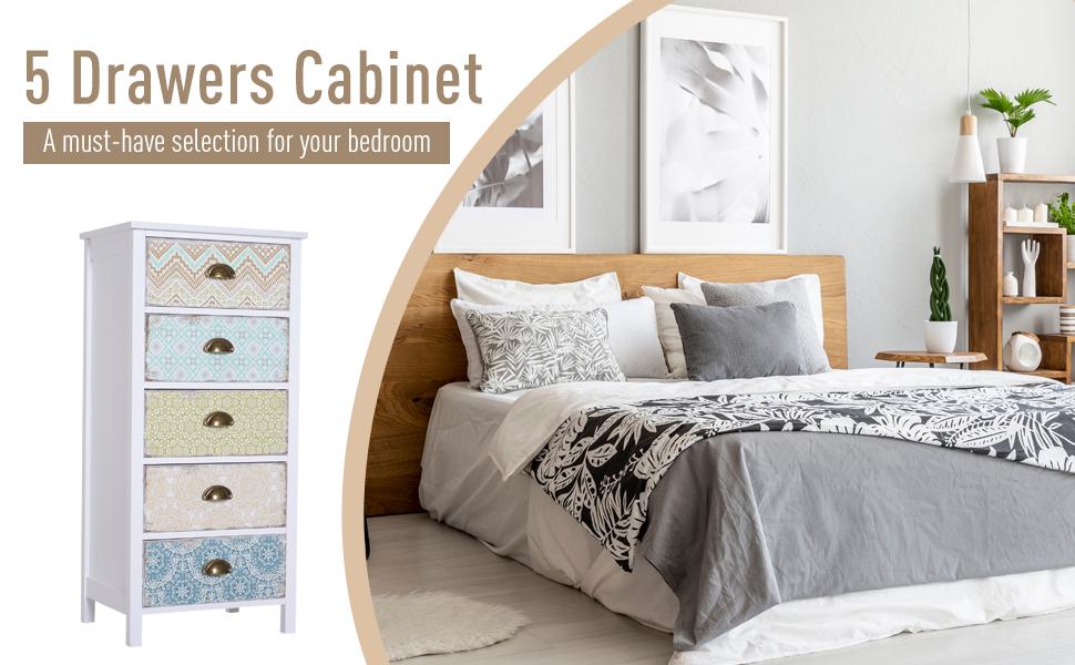 The HOMCOM Drawer Storage Chest will add vintage character and interest to any area of your home. Its narrow footprint makes it an ideal addition to small spaces, providing much needed storage without taking up too much space. It is adorned for being a perfect blend of minimalist style and exceptional functionality to meet all your storage needs. The 5 generous pull-out drawers have the ability to organize clothes, beddings and other essentials.