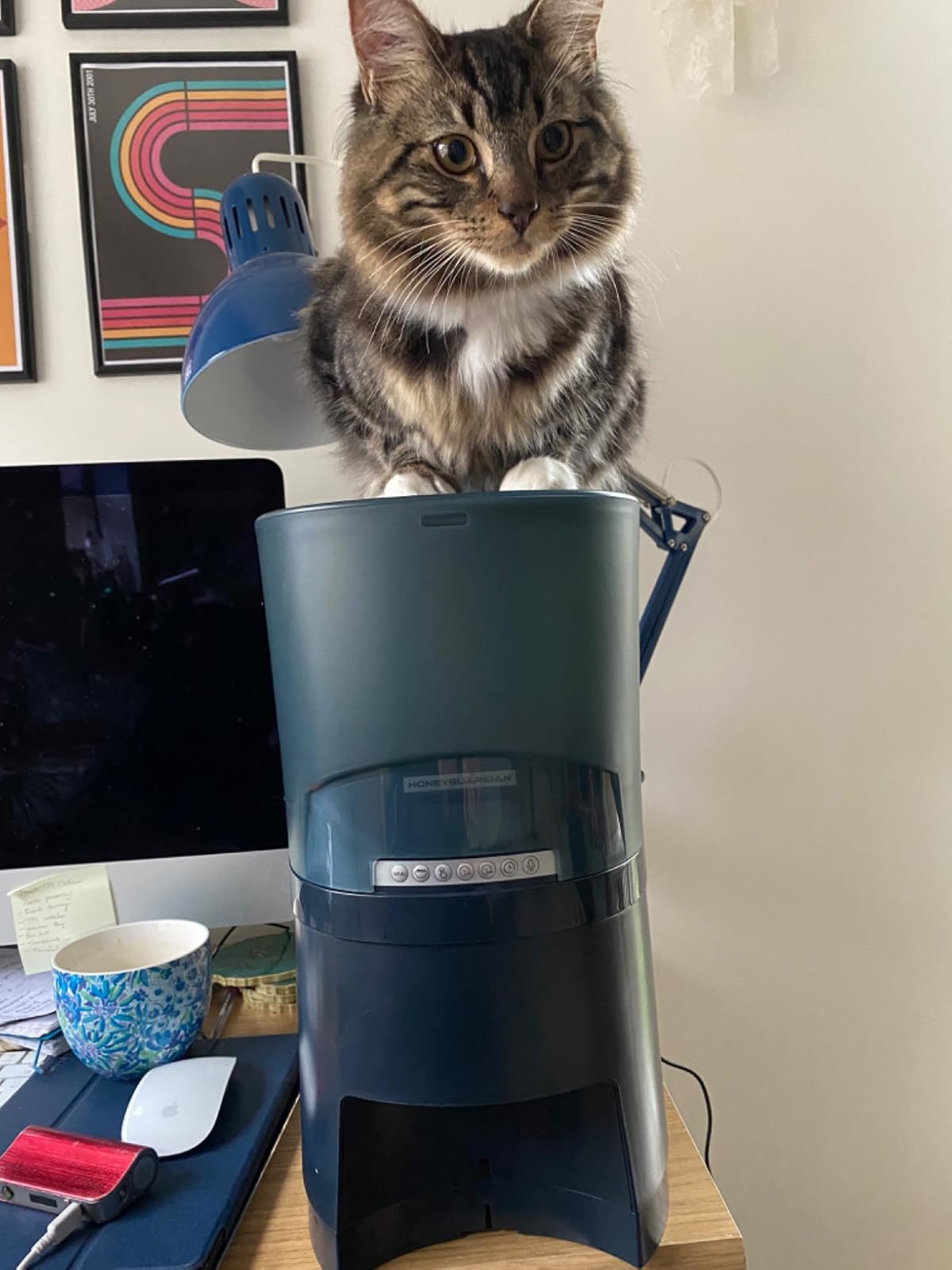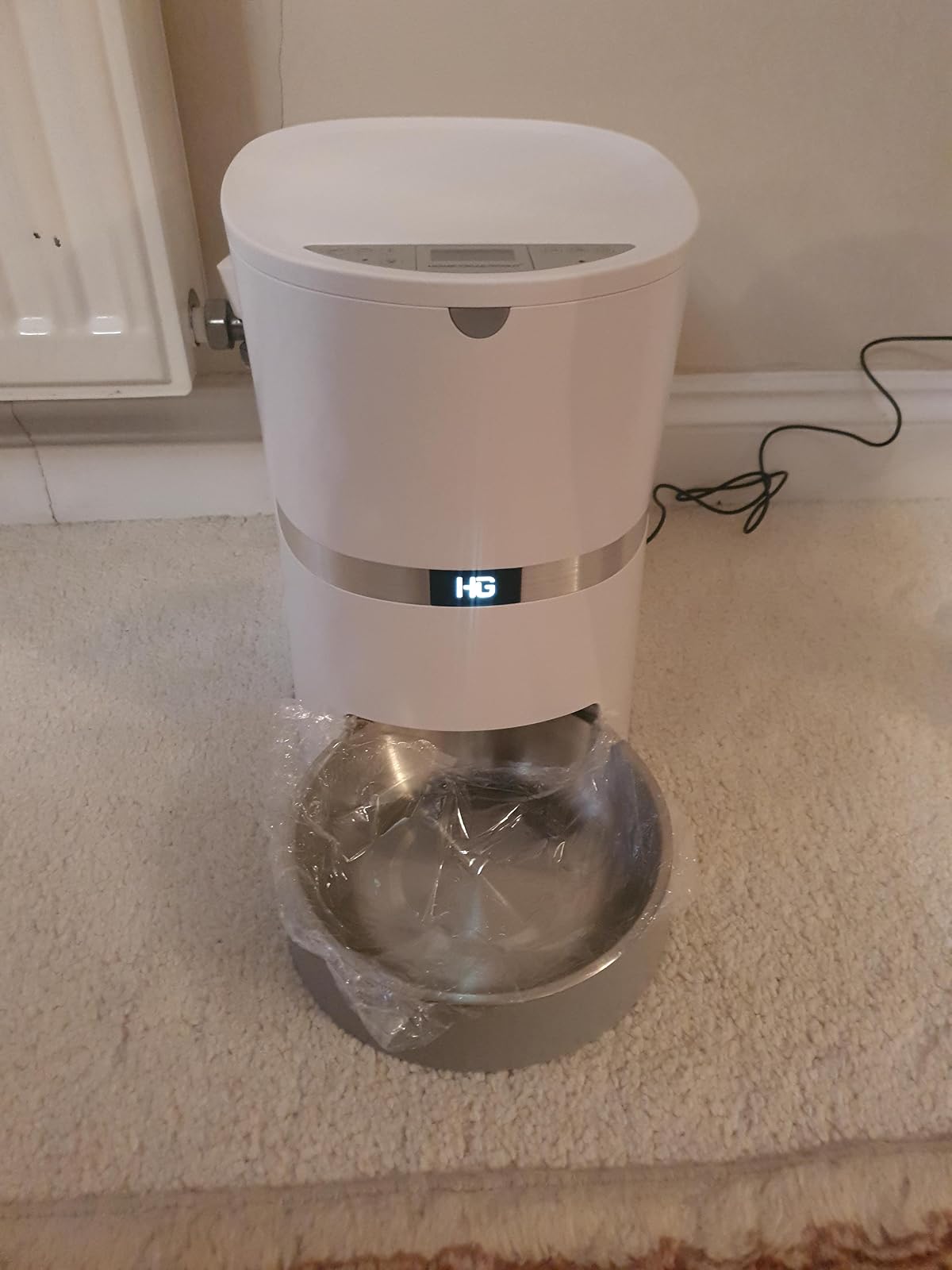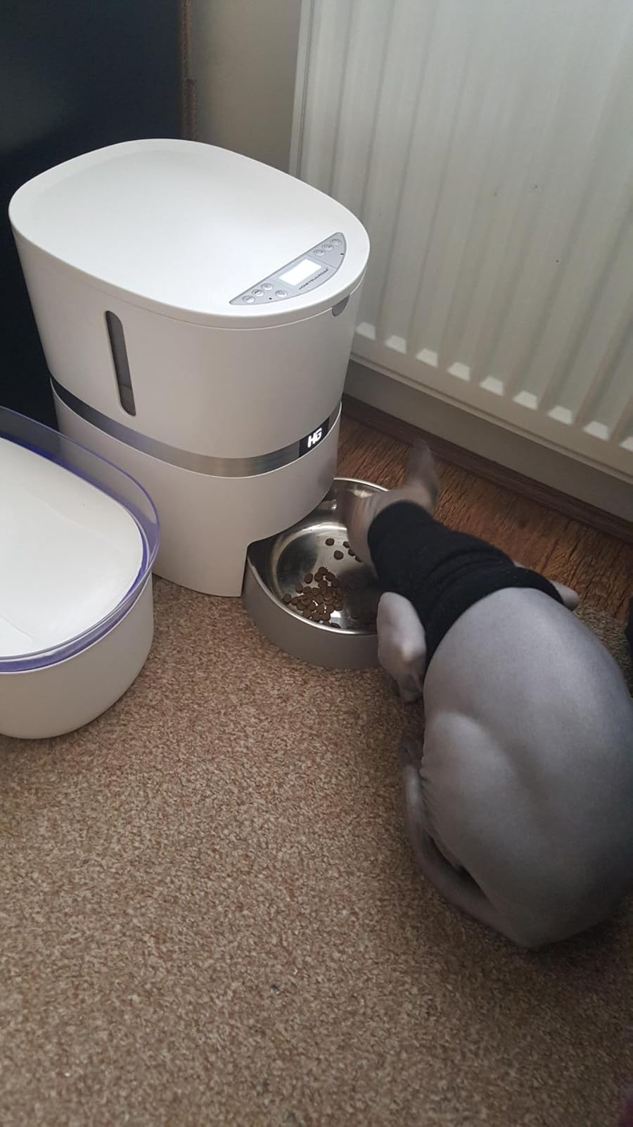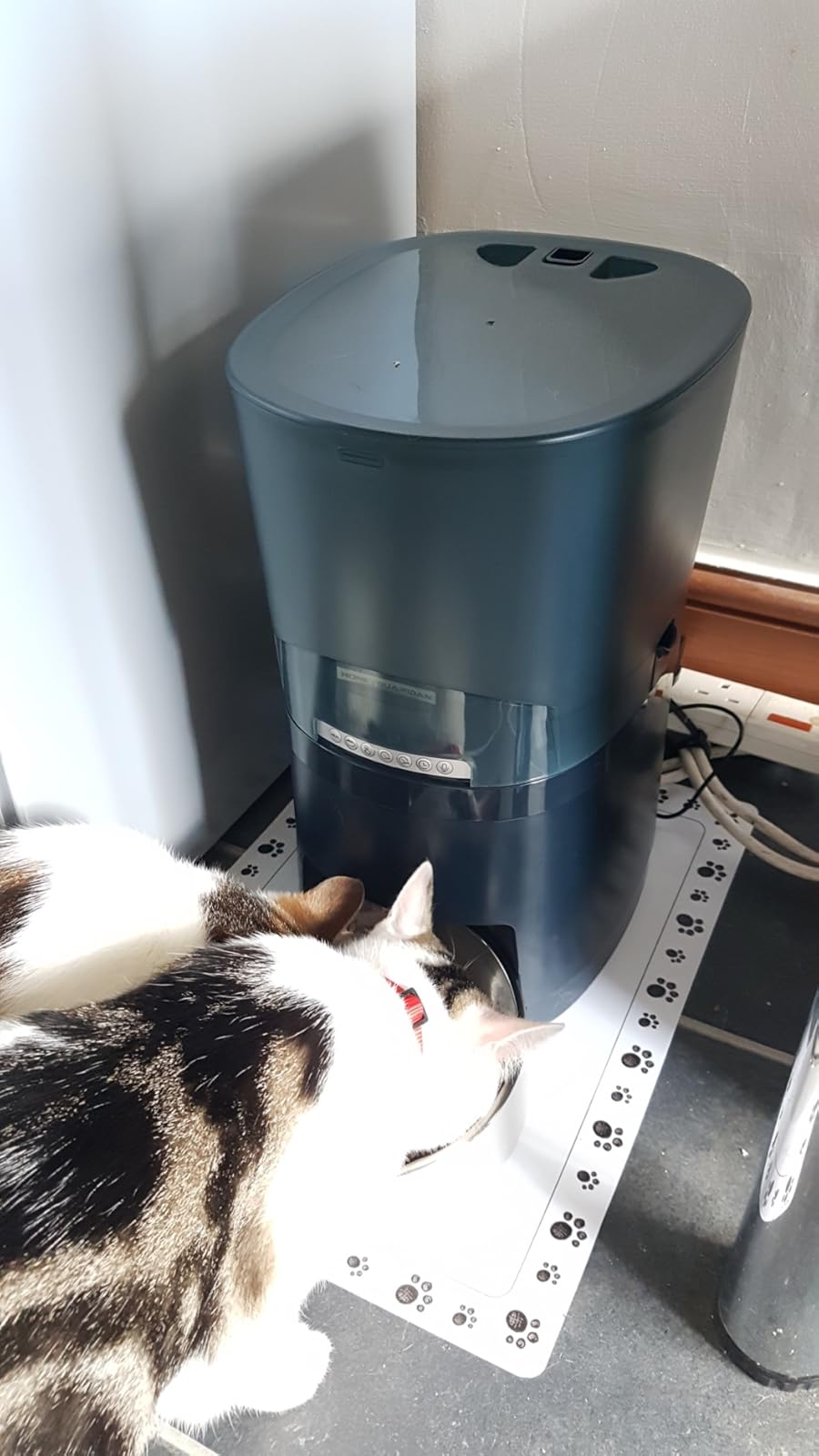 It is quite large and makes a statement, but the robot look is quite amusing. I found the programming very counter-intuitive, but once learnt is easy enough. The amounts dispensed seemed quite large for a cat, 4 is a meal for ours, can’t imagine heading into double figures and it goes up to 99! I do wonder how easy it is to clean properly.