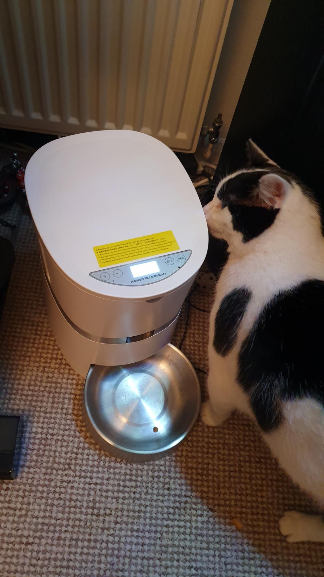 Arrived promptly and after watching the useful Youtube instruction video, I found this really easy to set up. The cat ate from it instantly, although he is ‘obsesssed’ with food, so I wasn’t too surprised. The voice recording sounds like me, and the cat now runs to the machine as soon as he hears the first call. My cat is on a measured diet, so I was hoping that this would alleviate all the prep work I was doing before and would deliver the correct amount of food to him. So far this seems to be doing the job really well, so much so, that whenever I go into the kitchen, the cat follows and sits in front of the machine in the hope that I will put food in it. I hoped this would also stop the early morning wakeup calls from Mr cat, as he would begin to disassociate me with delivering his food, but alas ‘No’, he still does this!