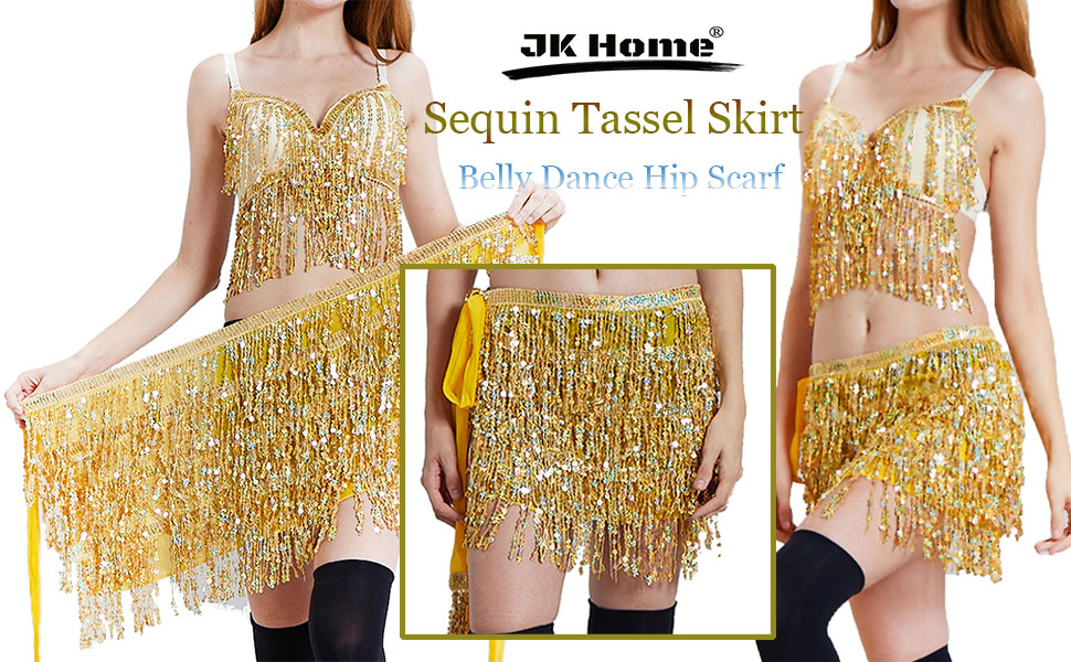 JK Home Women's Sequin Tassel Skirt Glitter Belly Dance