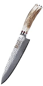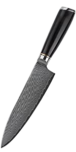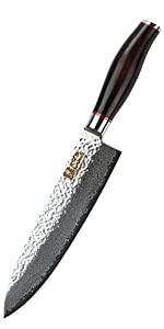Questo coltello da cuoco, composto da una lama dichiarata dal produttore, sul sito di vendita, realizzata in acciaio inossidabile giapponese G10 rosso, forgiato martellato e damascato a 33 strati con durezza HRC (58-60) e manico rivestito in legno di palissandro ecologico di elevata qualit.