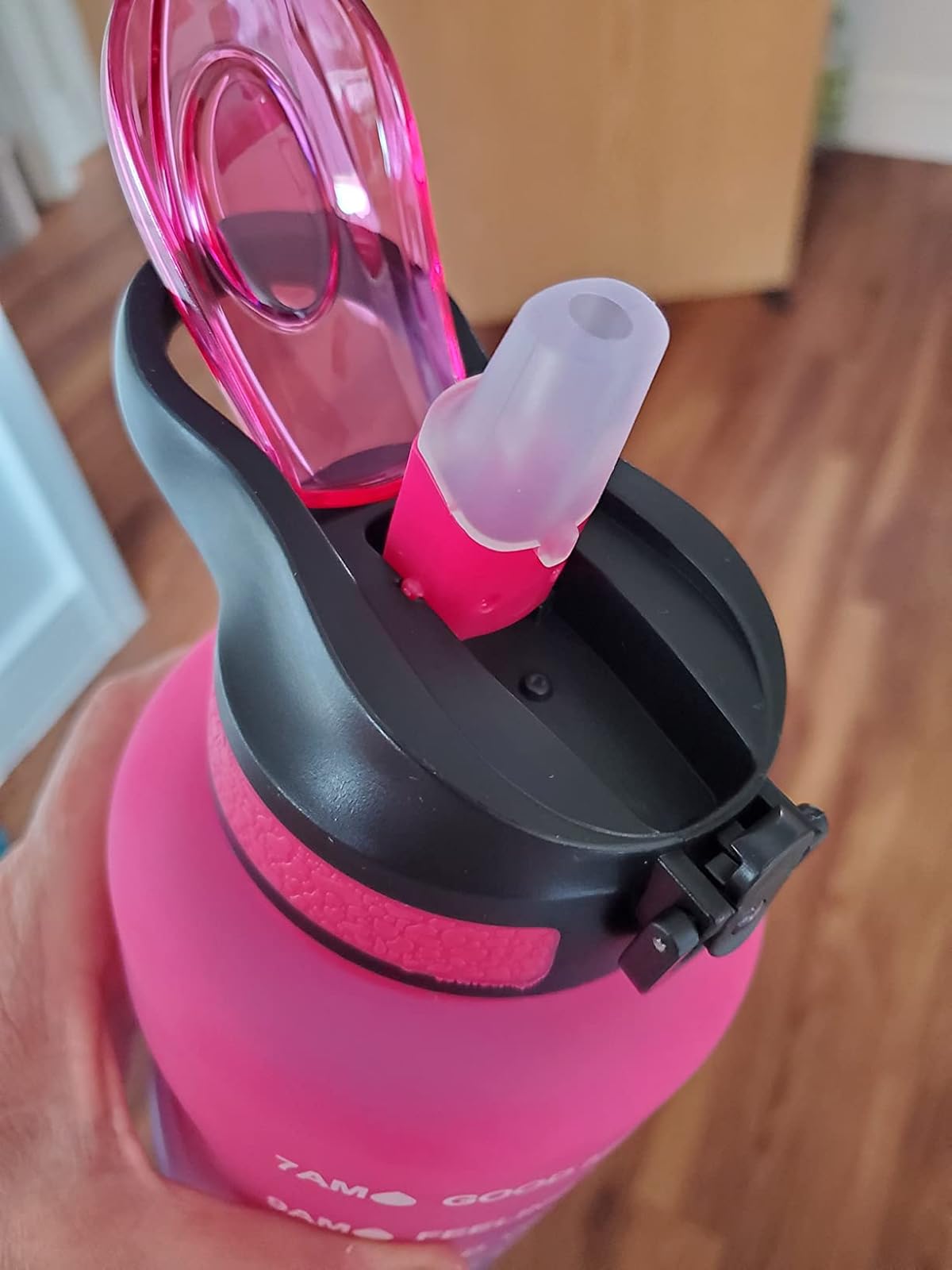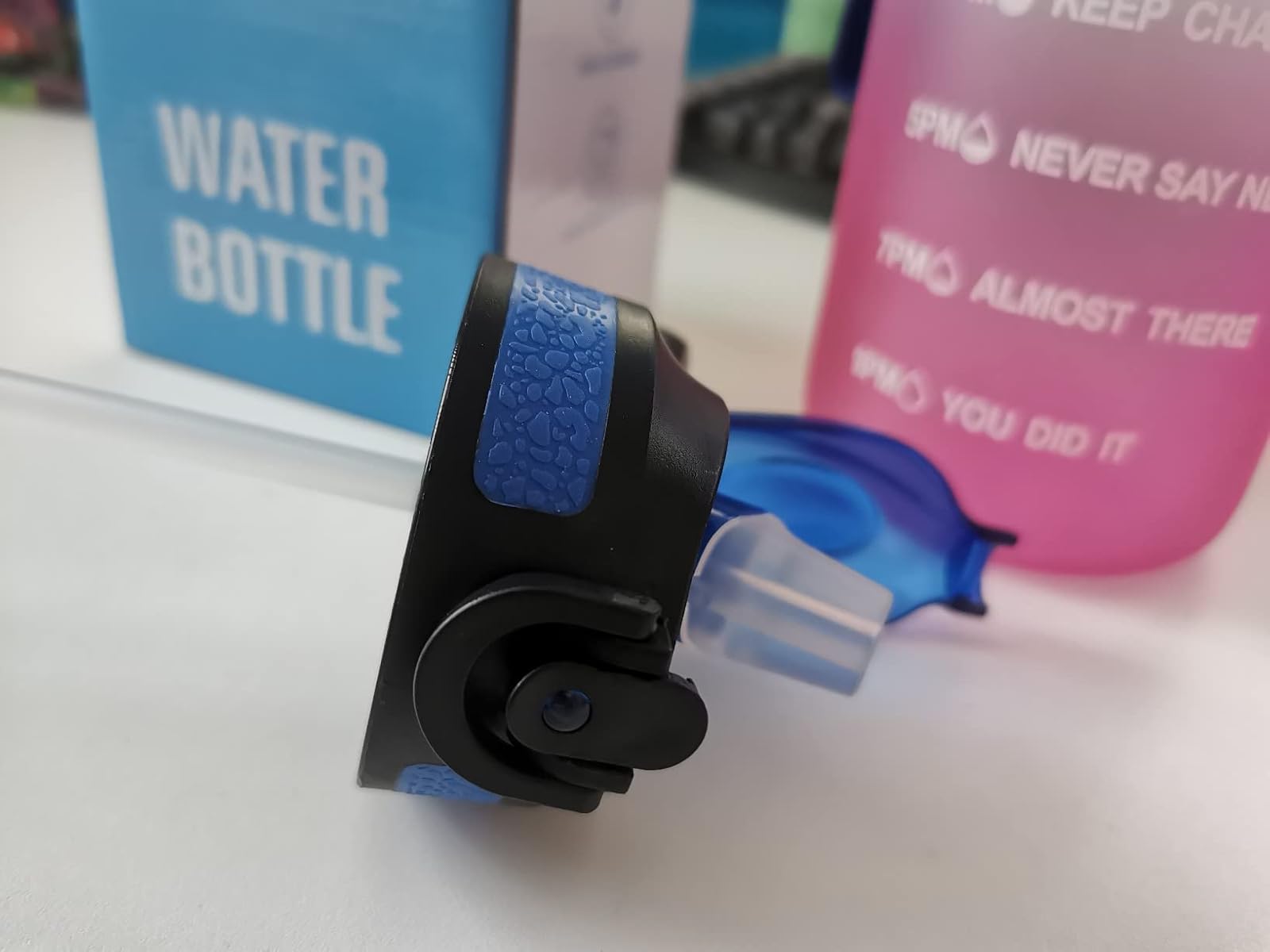 great water tracking bottle. It has markers printed on the bottle to help you keep track of how much water you are drinking. The text is easy to read and doesn’t come off when washed. I love that this bottle can easily be opened with one hand and has a lock closing latch you need to open and then press the button which will pop open the lid. It comes with a thick silicone straw that is easy to take a sip from. I also like the bottle design it has indents where you can place your fingers and keep a good hold on the bottle especially when you want a drink whilst on an exercise machine. The bottle is made of very strong durable plastic and is easy to wash/clean. The lid also has a silicone ring which it stops water from leaking. Great looking bottle also comes with a little hoop you can hold the bottle from on your wrist.