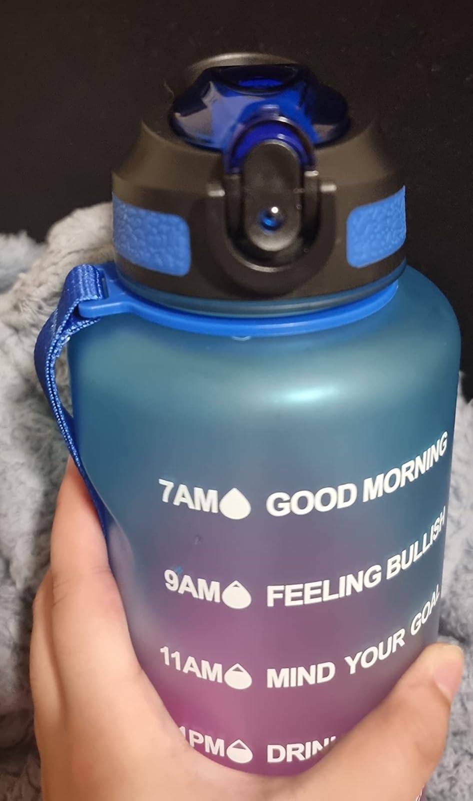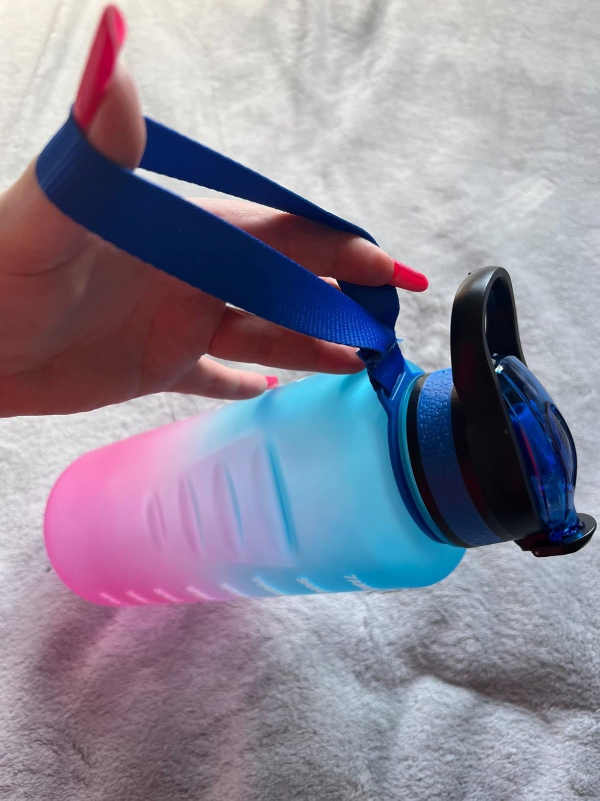 Good quality motivational water bottle with lock feature. You can easily track your water intake with the intake guide on the bottle. It got a lovely dual tone colors. The strap has a good thickness to it. The lid opens easily and can be locked to secure the lid when being stores in the bag.