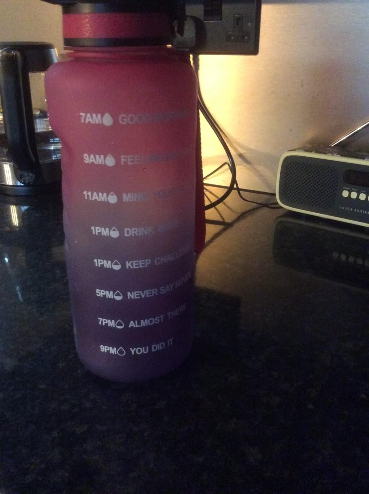 I have started to try and lose weight, I have joined slimming world and part of my commitment is that I would start to drink more water. I got this bottle as it is measured out for you and I know that once I drink one bottle I have drunk 1.5L. The timings on the front with the encouraging terms really help me to drink the appropriate amount of water in a day. I really like the pink and purple colouring as well.