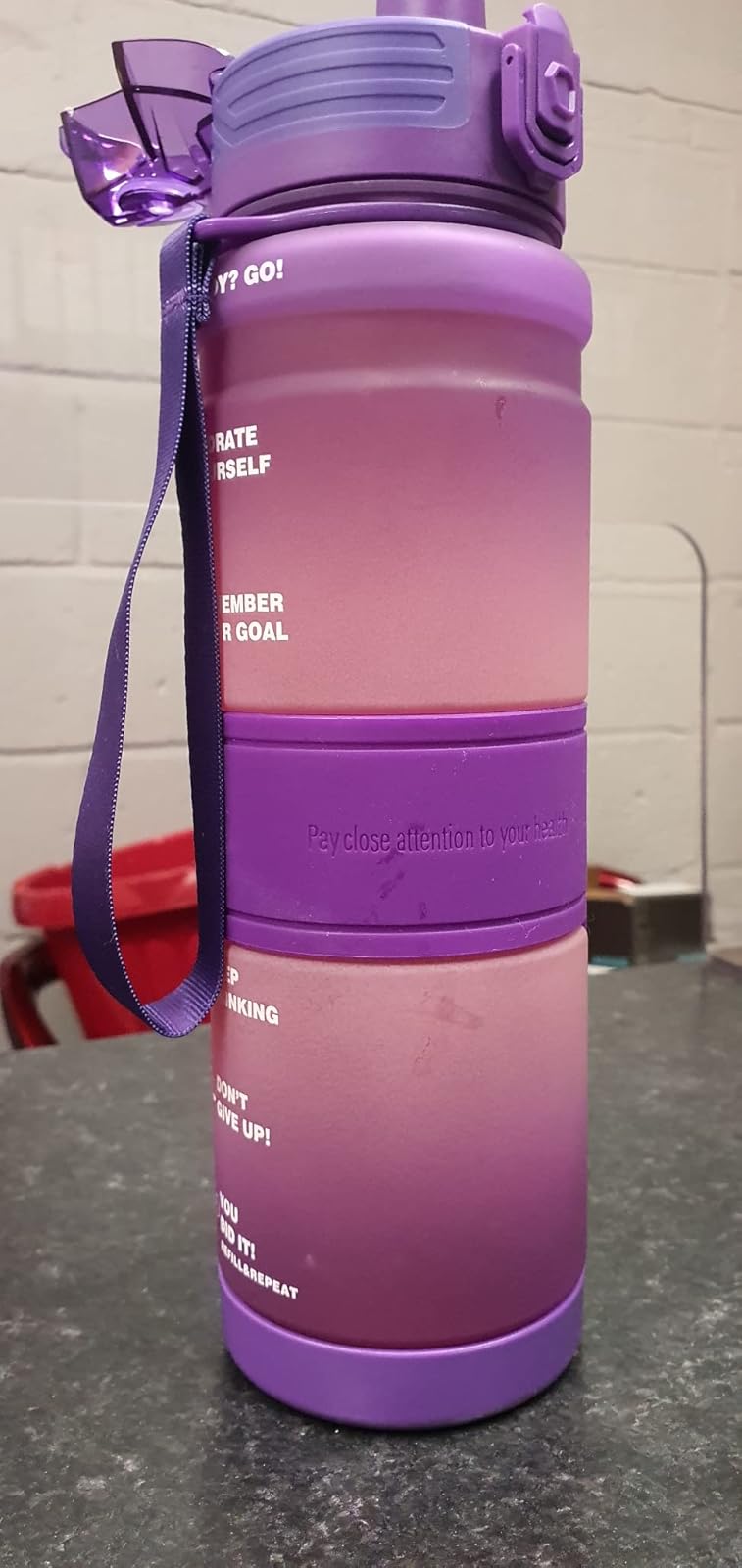 Trying to keep up the 2 Litre a day water regime is always tough. With this I make sure I drink at least two of these, keeps my motivated to drink more water. I take this with me everywhere.