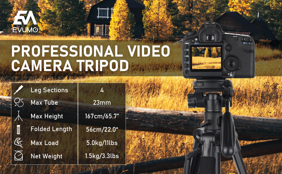 This review evaluates the “65.7” Professional Video Camera Tripod” made by EVUMO.