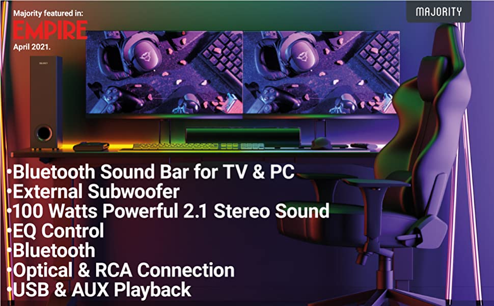 Majority Bowfell Bluetooth Sound Bar for TV | 100 Watts Powerful 2.1 Stereo Sound | Soundbar for Gaming, TV, Football, World Cup, Movies and Music | Bluetooth, Optical, USB & AUX Playback
