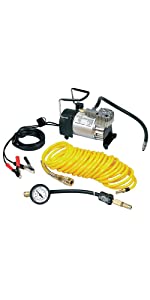 Inflates a car tyre from flat to 35PSI in under 4.5 minutes. It is powered from your in-car 12V socket, with a long 2.9m cable to reach the tyres all around the vehicle.