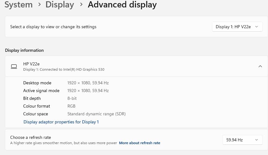 I was pleasantly surprised to see that navigating to display settings also offered 50HZ (windows 11 – not available in Windows 10!!) as well as the more common 59.94HZ or 60HZ. So now I can watch and edit European format videos (PAL 50p or 25p) nice and smoothly. For 30p/60p video I use the 59.94HZ refresh rate.