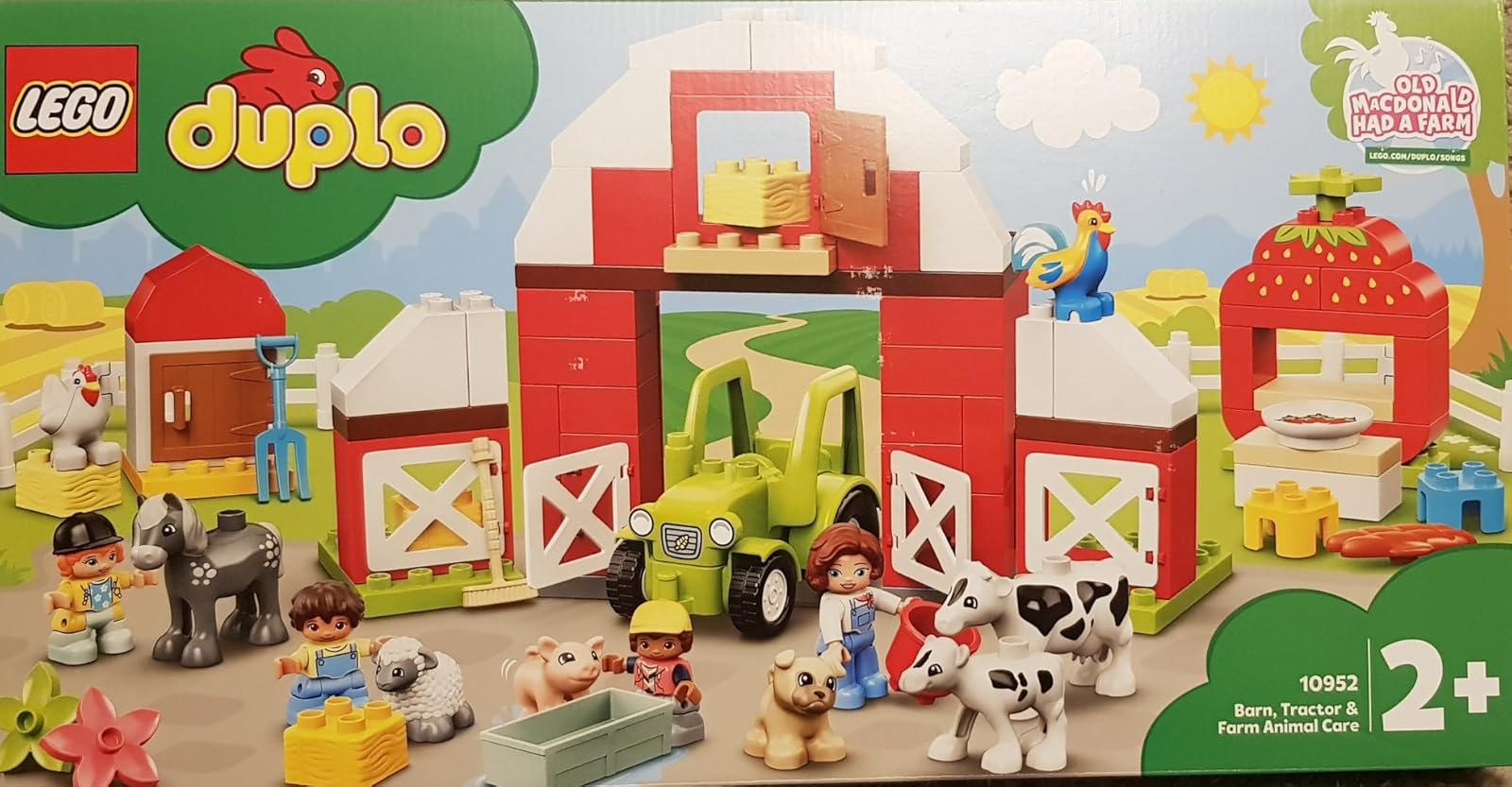 Lego duplo 10952 barn, tractor and farm animal care. The set is massive. A great starter set that’s fun and easy to get them into the world of Lego. Can easily be an additional set or a first set to start them off. The set comes in a large colourful box, showing you a picture of the completed model on the front and back of the box. You get everything you see, with a contents list on the side. You get to make and put together a tractor, barn and a strawberry stand. The barn is about 23cm in height, 20cm in width and 11cm in depth. The set includes 4 lego duplo people figures, pig, sheep, horse, dog, hen, rooster and a cow with her calf. Theres so many fun additional pieces to enhance play; pen, farming tools and even flowers. The doors all open up on the barn and chicken coop. The set has chunky pieces to make it easier for younger ones to learn to build and create models or introduce them to the making world of lego. The figures are already formed, with movable arms, legs and head. The pieces are all of a good size for little hands to grip and hold onto. Aswell as being a set for fun play, it’s a great way for children to be imaginative and also help develop fine motor skills, specially designed for small hands. Inside everything is contained in bags, you can locate each piece easily and follow each part in the correct order. There 3 little instruction manuals which are well illustrated with clear images that are easy to understand and follow with each piece recognisable. The set contains 97 pieces. The set is fun and colourful and suitable for both boys and girls. Theres nothing to dislike about the set. Duplo is s great set for little hands to build and play. Would make a great gift for any occasion.