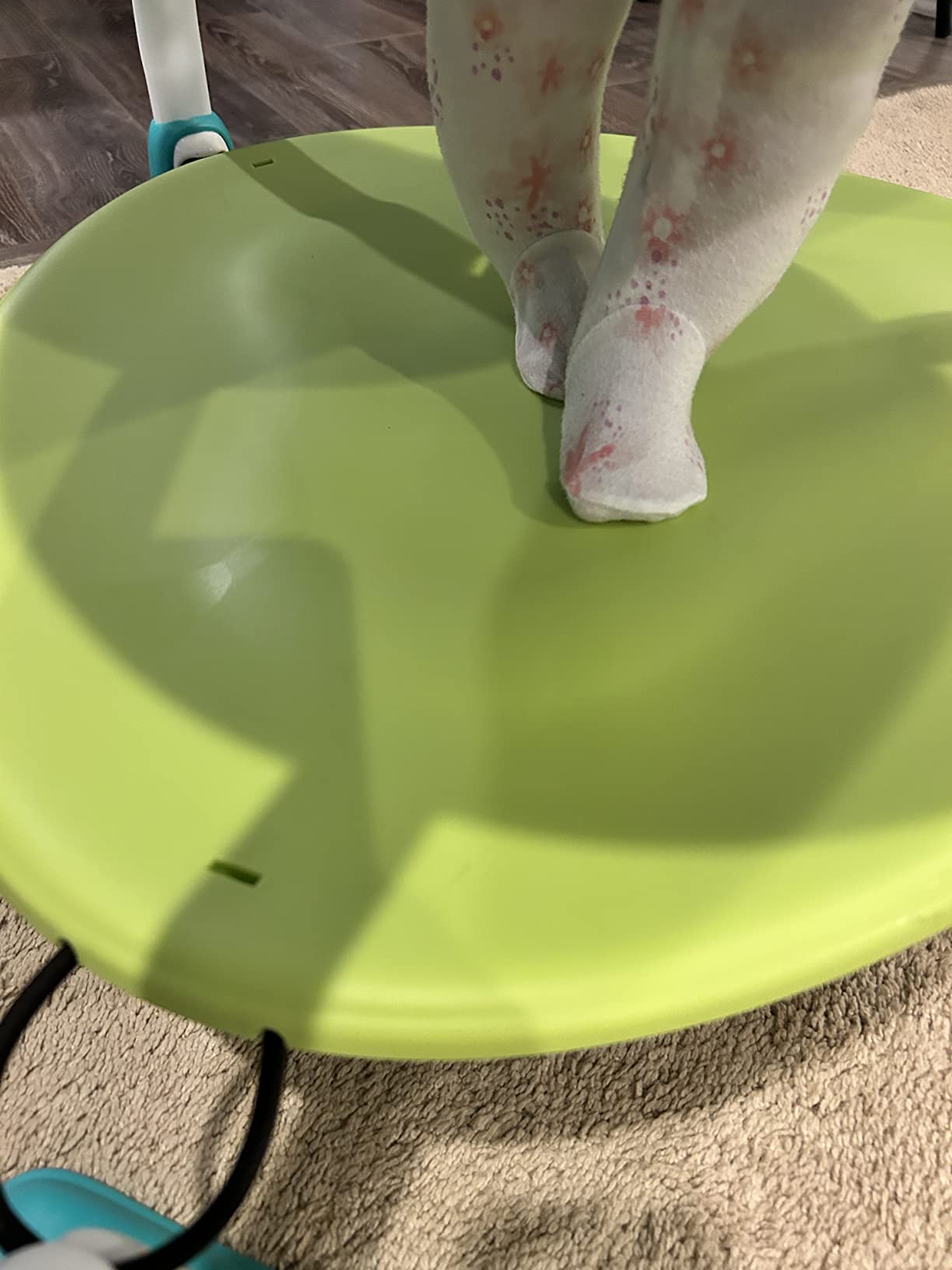 This baby jumper is great at keeping my baby happy and curious. The only flaw here is how even on the highest notch, the pad is still too far away from my 6 month old to touch with his feet. So I have to use a pillow to help his feet touch on something for support. Outside this flaw, it’s a great purchase.
