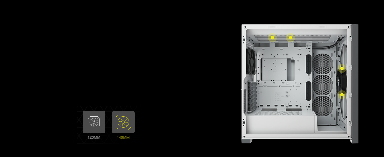 Fan mounts feature wider cutouts, allowing fan placement customization and flexibility.
