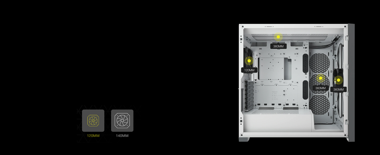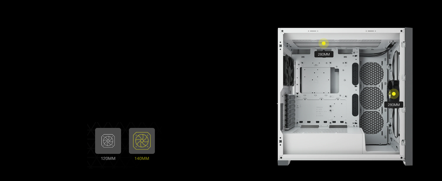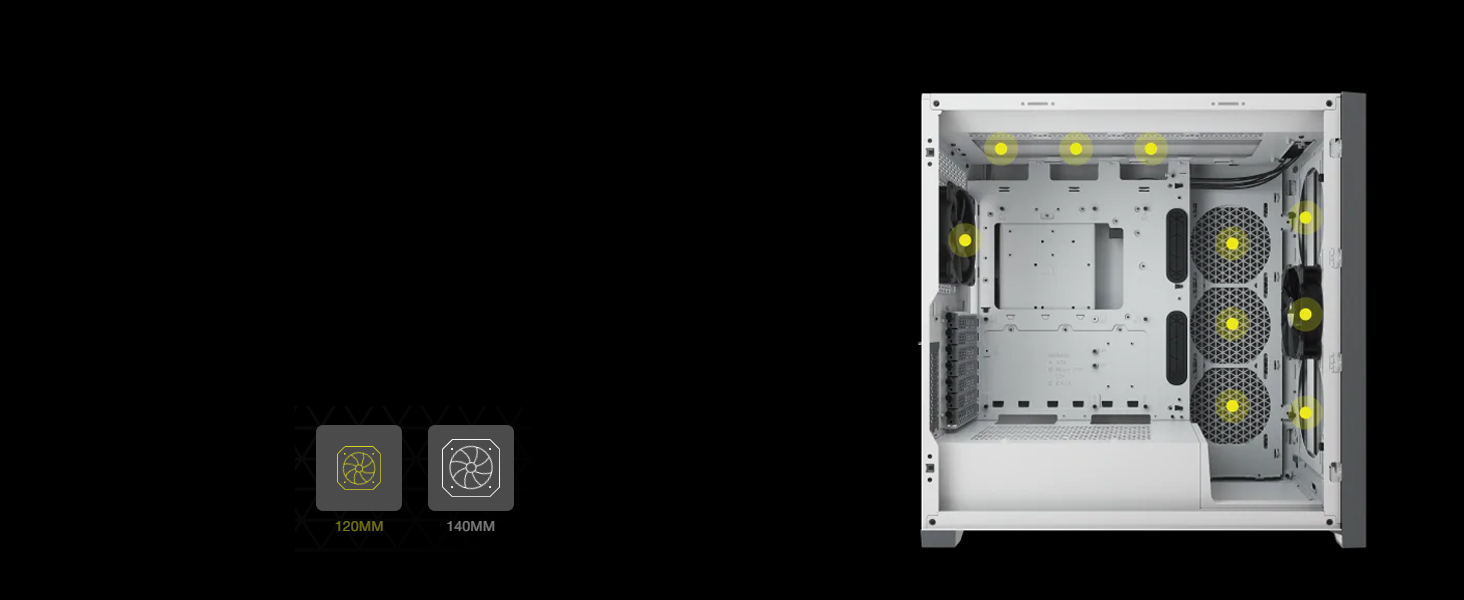 A spacious interior fits up to 10x 120mm or 4x 140mm cooling fans, along with multiple radiators including up to a 360mm in front or side and a 360mm push/pull in the roof.