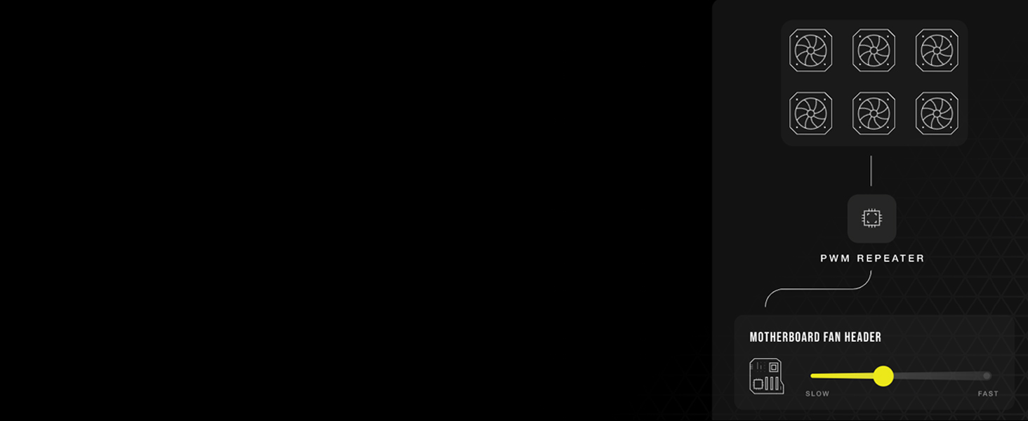 A PWM fan repeater controls the included fans, with connections for up to six in total. Reduce fan speed when you want to keep your system quiet all from a single 4-pin PWM header on your motherboard.