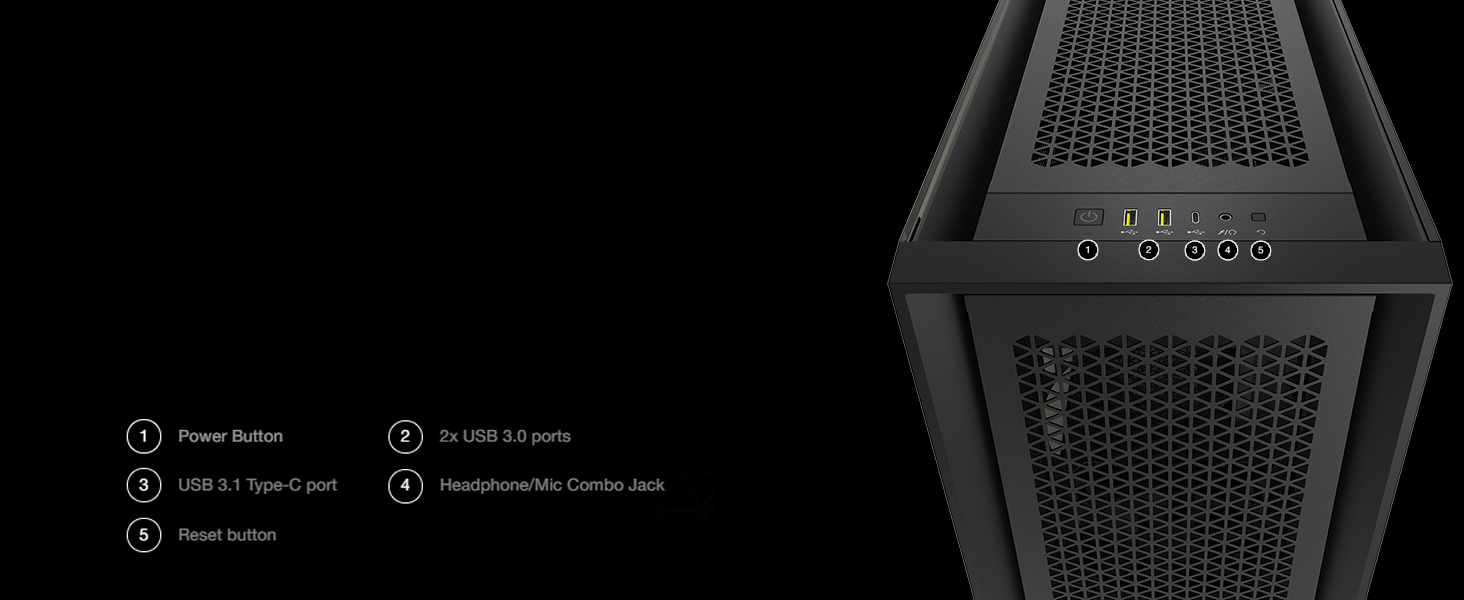 Front IO features audio, 2 USB A and 1 C, reset and power buttons.