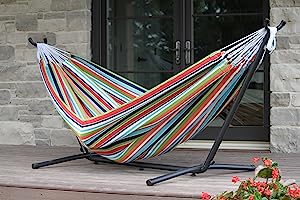 Vivere Double Cotton Hammock with Space-Saving Steel Stand Including Carrying Bag, Rio Night, Salsa