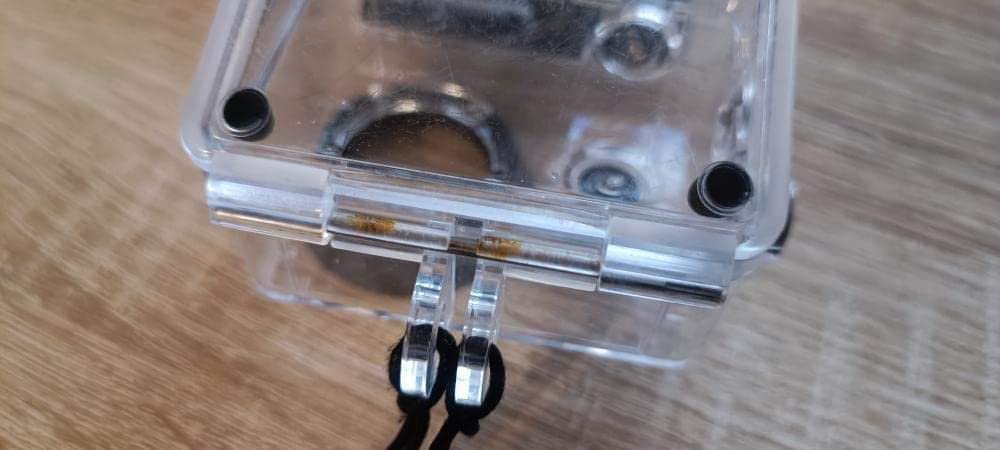 Le clapet de la batterie ne m’inspire pas confiance vu sa minceur, par contre camra et accessoires semblent de qualit, voir dans le temps. Comme on n’a pas tous besoin du caisson tanche, la lentille de l’objectif mriterait d’tre protge par un “pare-soleil” plus haut, plat la lentille touche, donc rayures prvisibles, peut-tre que l’angle de 170 l’impose, tester.