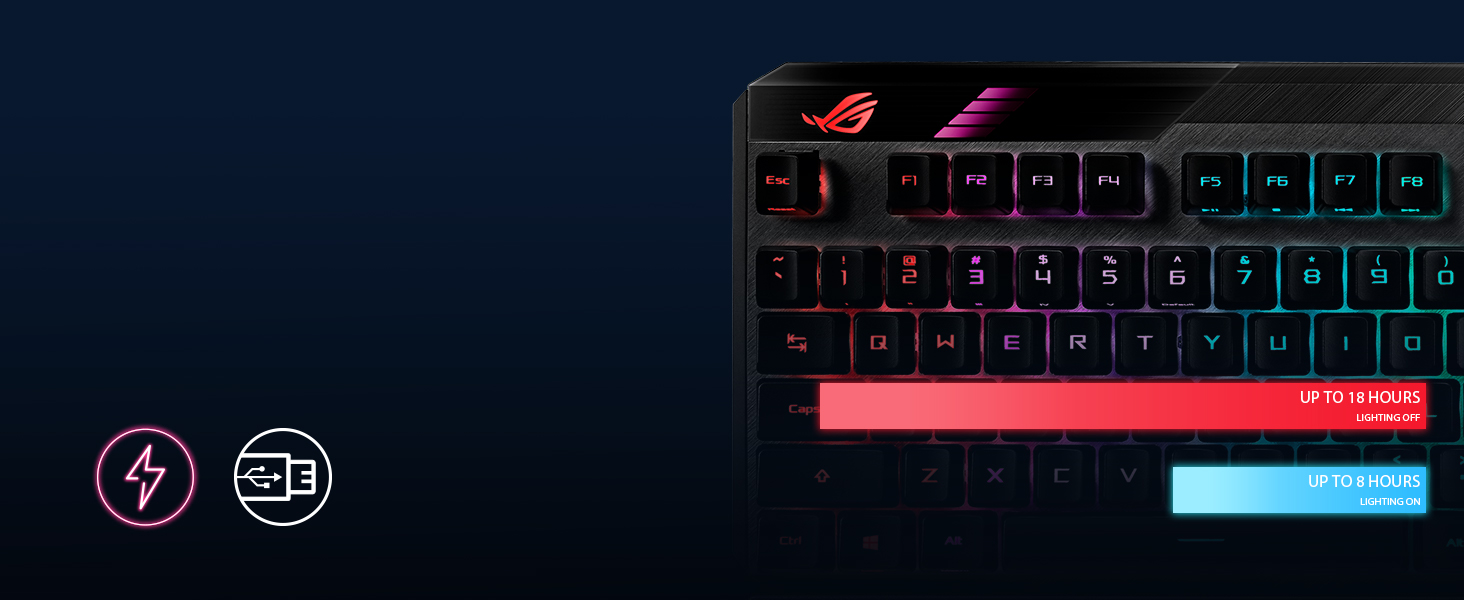 30 minutes of USB-C fast charging allows operation for up to 18 hours (lighting off). The fast-charge function can be switched off to use the provided USB passthrough by pressing Fn + F12.