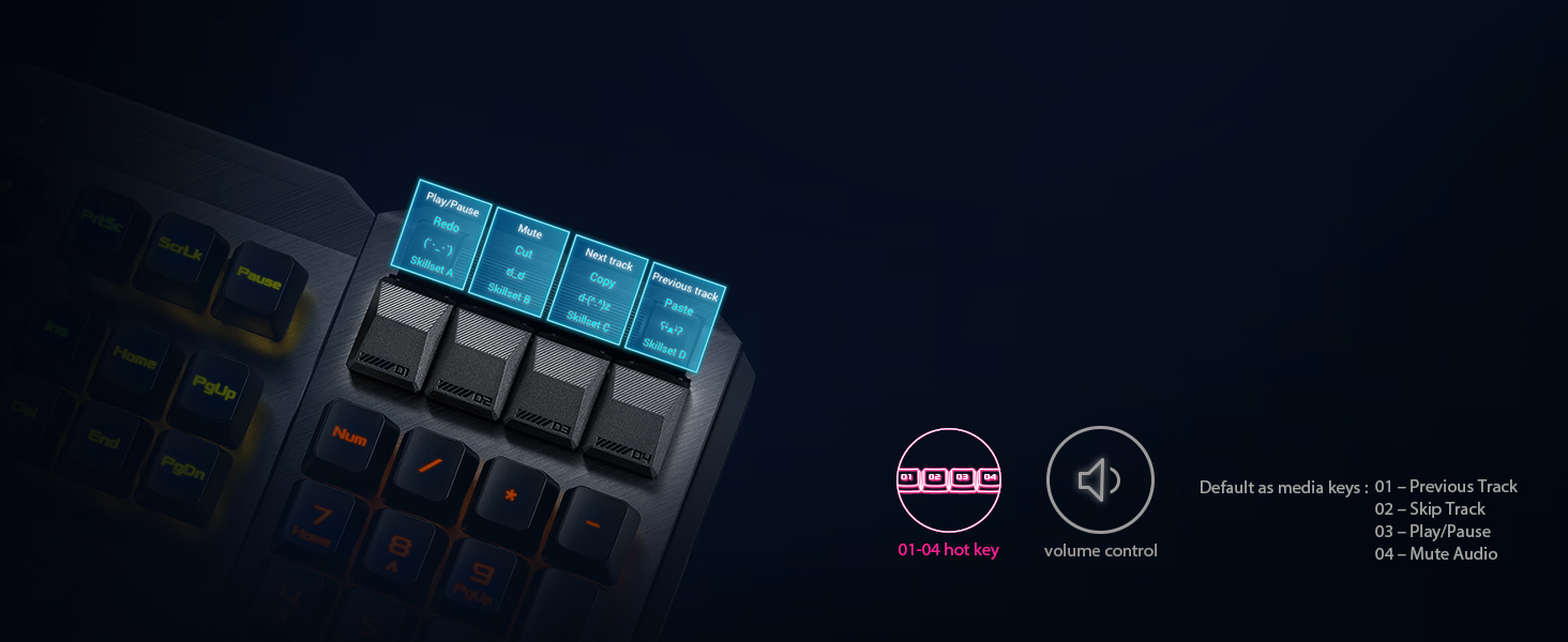 The detachable numpad includes four media control keys that can be programmed into hotkeys or macros. There’s even a built-in control wheel for quick volume adjustment.