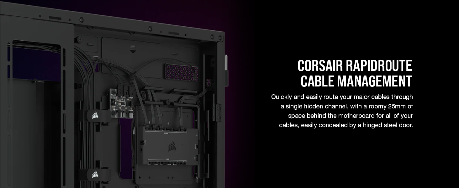 Plenty of room for radiator use and cable management is not an issue. Glass panels are sleek and mechanical engineering is top notch can’t fault Corsair with this one