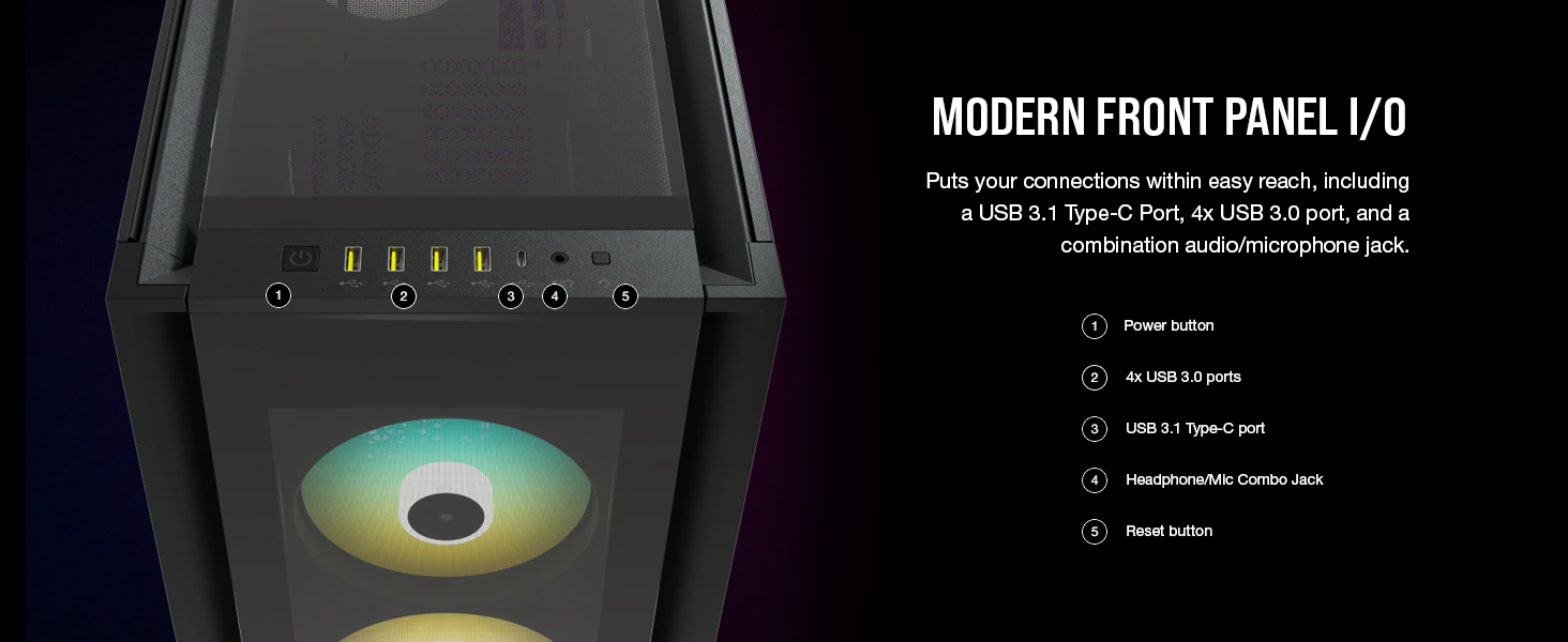 ” data-position=”triggerHorizontal” />Modern front I/O connections including 1x USB 3.1 Type-C port, 4x USB 3.0 ports, 1x mic/audio jack, power button and reset button.