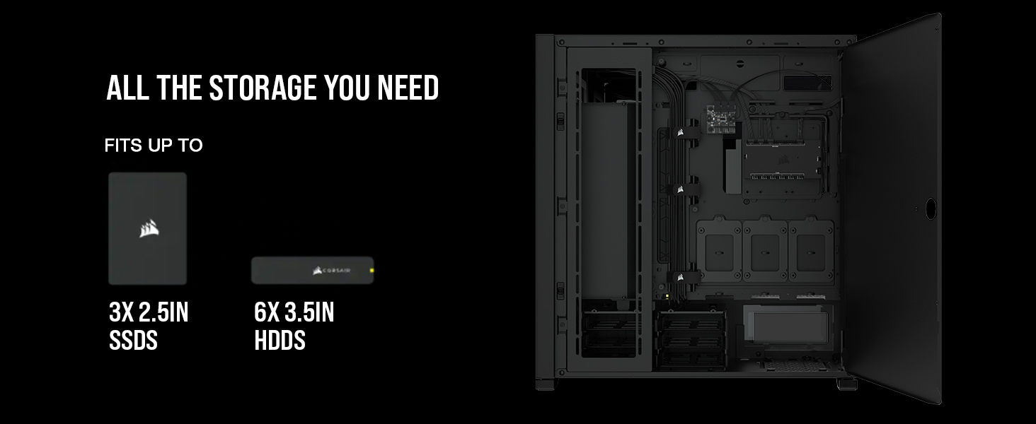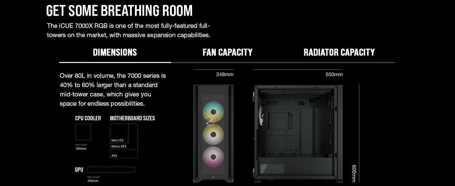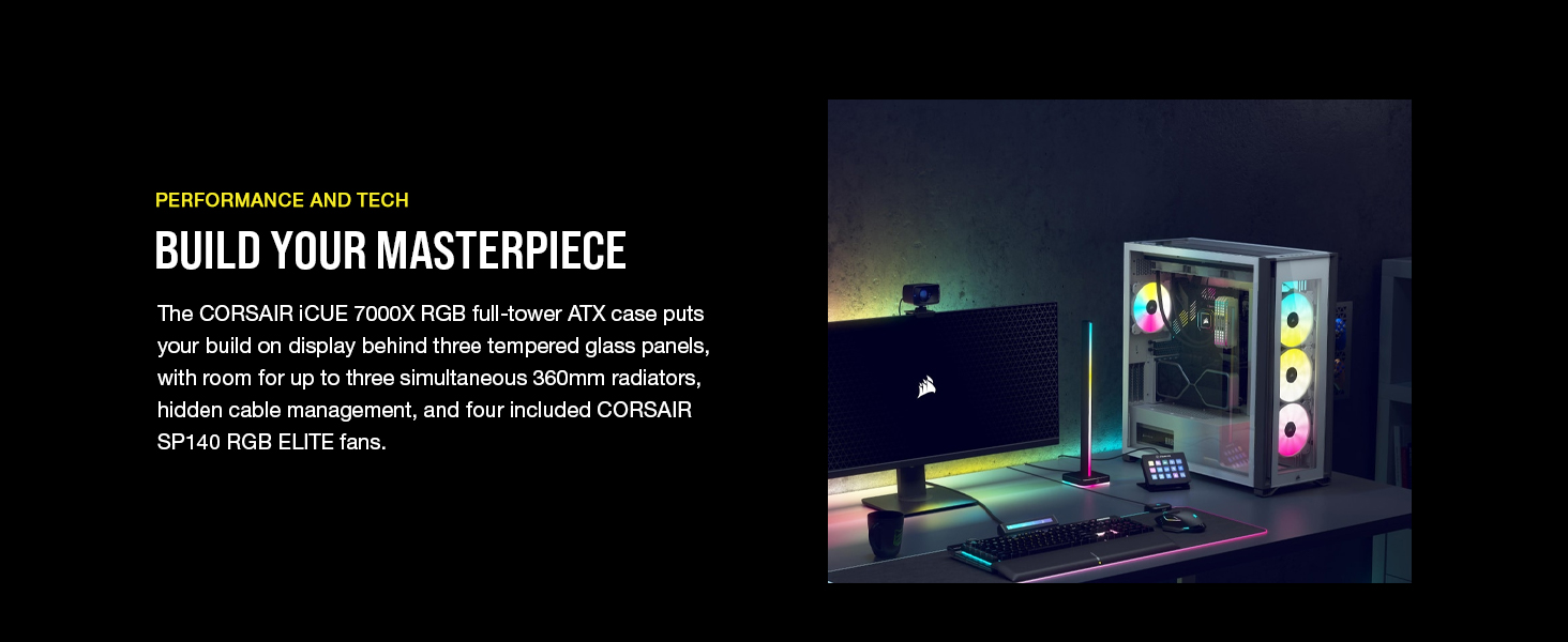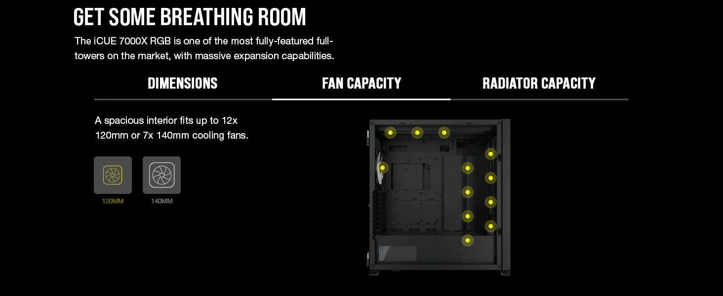 ” data-position=”triggerHorizontal” />Four included CORSAIR SP140 RGB ELITE fans, fits up to 12x 120mm or 7x 140mm cooling fans.