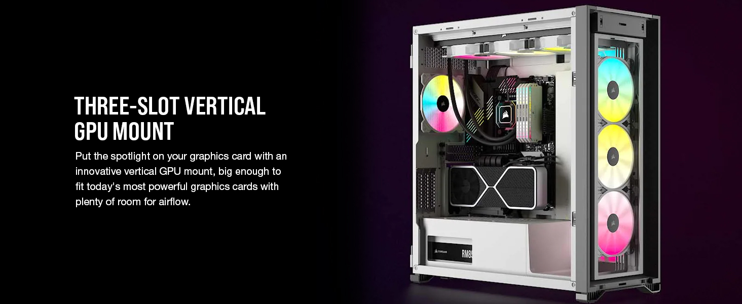 Single downside: I was able to vertical mount a 2080 ti which was awesome. Looked good and helped with the cooling on that older card. Recently replaced with a 4080 Super and this card will not mount vertically. Not a huge deal but this was one of the main reasons for getting a full size tower at this price point. iCue RGB controller and fans are top notch.