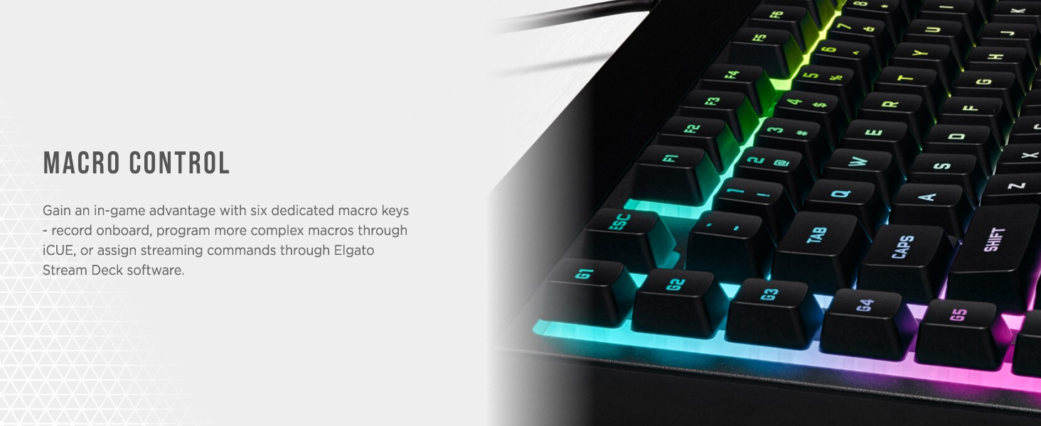 – The keyboard has macro buttons that you can map on the iCue software to create complex macros and simple macros