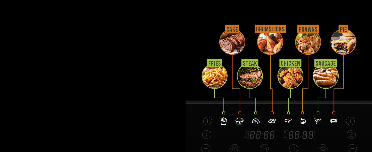 Touch buttons to cook Fries, Cakes, Steaks, Chicken, Chicken Drumsticks & Wings, Sausages & Quiche
