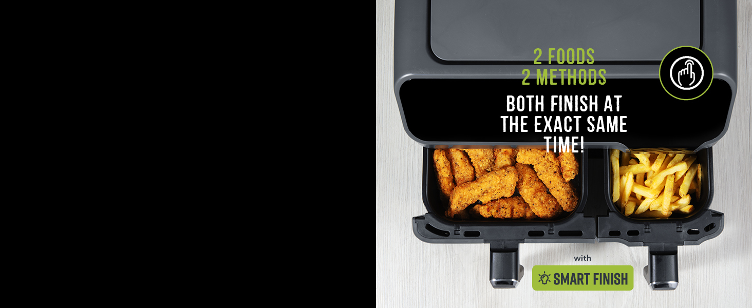 Why settle for an Air Fryer with one cooking basket when you can have two! The two baskets are different sizes, one is 3.3L and the other is 5.2L meaning you can mix and match to meet all your cooking needs. The easy to use controls allow you to use one basket at a time or use both together; you can even set different cooking times at different temperatures for each basket. The combined 8.5L capacity is large enough to create crispy and healthy meals for up to 8 people at once.